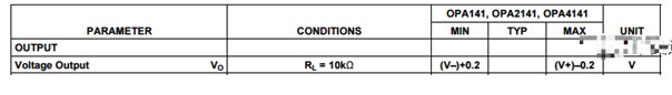 輸出是141.57mV,為什么差距這么大呢?這是由運(yùn)放的輸出限制引起的,OPA141的輸出限制如圖所示:
