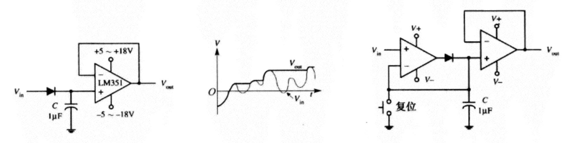 該電路最為峰值檢波器,跟隨輸入電壓信號(hào)并存儲(chǔ)其最大電壓到電容上。下圖電路的運(yùn)算放大器作為緩沖器,“檢測(cè)”電容的電壓并輸出,防止電容放電。二極管防止當(dāng)輸入電壓低于存儲(chǔ)的峰值電壓時(shí)電容放電。第二個(gè)電路是更加實(shí)用的峰值檢波器,它外加一個(gè)運(yùn)算放大器使得檢波器更靈敏,并把電容的電壓反饋到反相輸入端,以補(bǔ)償二極管的壓降(0.6V左右)。換句話說,它是一個(gè)有源整流器。該電路還外加一個(gè)開關(guān)來復(fù)位檢波器。通常,用FET代替二極管,同F(xiàn)ET門作為復(fù)位開關(guān),減少電容的容量可加速對(duì)Vin的充電反應(yīng)時(shí)間。