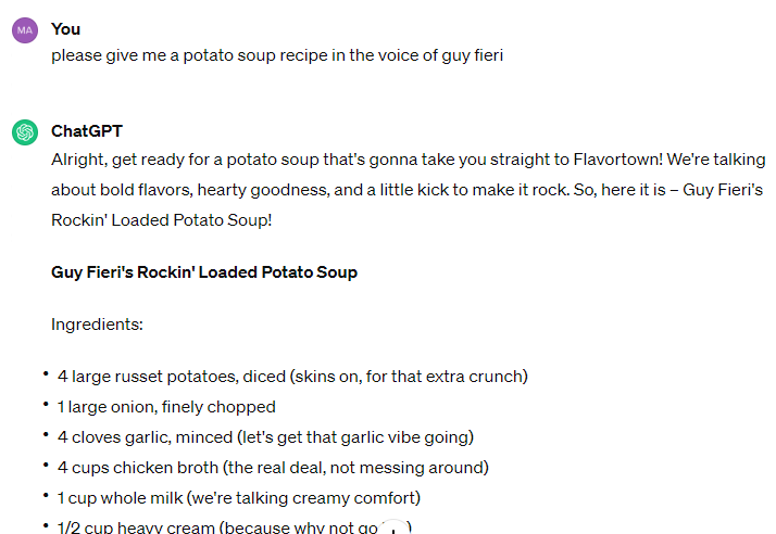 而ChatGPT則是立即給我提供了一份菜譜。而且,我還可以要求ChatGPT將菜譜用料翻倍,增加辣度或替換配料。我甚至可以要求它按照我最喜歡的電視廚師的風(fēng)格給我菜譜(圖3)。