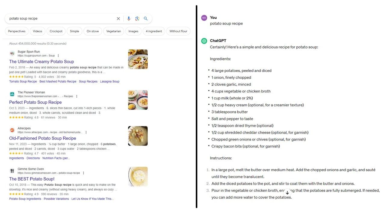 零點擊搜索讓你在電腦或手機(jī)上的搜索速度更快,而且還能提供語音搜索結(jié)果。雖然“今天天氣如何?”之類的短句有助于快速搜索,但像食譜這樣的長篇搜索結(jié)果仍然需要我們點擊查看。而這正是AI的優(yōu)勢所在。圖2顯示了給谷歌和ChatGPT提供相同提示:“土豆湯菜譜”,所得到的不同結(jié)果。