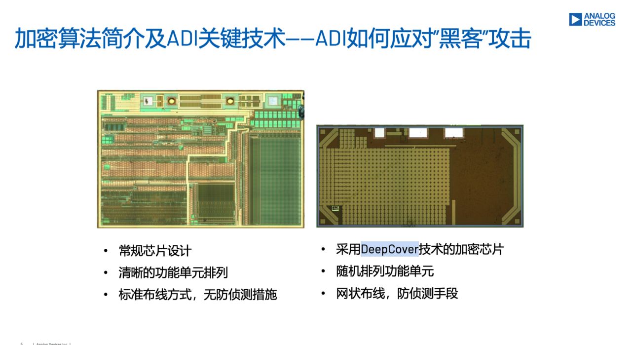 為了防止黑客攻擊,ADI的安全芯片內部采用了和常規(guī)芯片不同的布局,叫做DeepCover技術。常規(guī)芯片具有清晰的功能單元排列和標注的布線方式,很容易被側向信道攻擊等方式所破解。而ADI的安全芯片內部是隨機排列的功能單元,并使用了網狀布線。據(jù)劉武光介紹,芯片內部采用的是平衡電路,不論是0或1都不會產生電流的變化,因此黑客無法從外部通過電流或功率分析的方式對密碼進行破解。此外,ADI的安全認證芯片上有一個具備主動監(jiān)控的模具防護罩。當受到偵測時,保護層會發(fā)生變化。當芯片上電檢測到這一變化之后,就會啟動自毀程序,自動清除掉密碼,不給任何第三方攻擊芯片的機會。