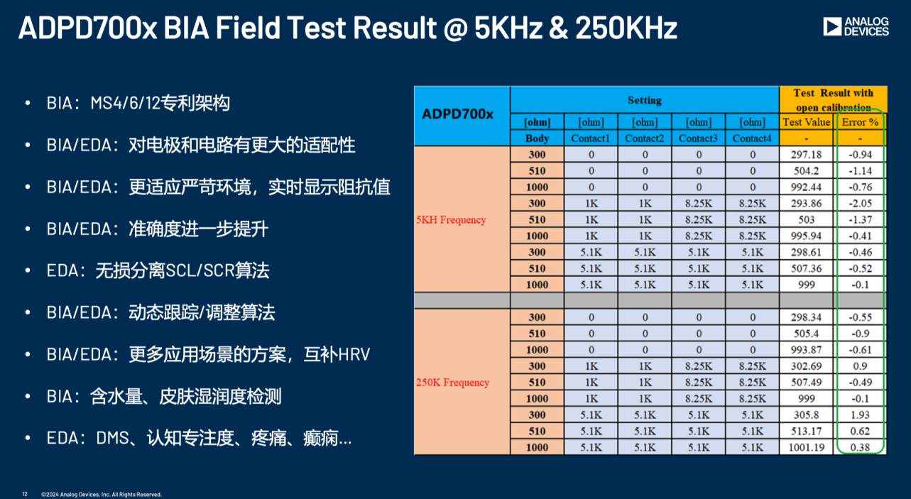 該技術(shù)原理聽(tīng)起來(lái)比較簡(jiǎn)單,但實(shí)際實(shí)現(xiàn)的難度極高。因?yàn)檩^慢的掃描頻率下的阻抗誤差很大,較快的掃描頻率下又會(huì)瘦到細(xì)胞膜導(dǎo)致的寄生電容印象。而ADI的MS4/6/12專利架構(gòu),可以將整體的誤差值下降到2%以內(nèi)。