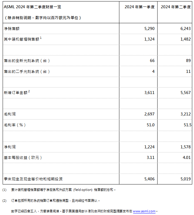 ASML發(fā)布2024年第二季度財報 | 凈銷售額62億歐元,凈利潤為16億歐元,預期下半年業(yè)績表現(xiàn)強勁,2024年凈銷售額將與2023年基本持平