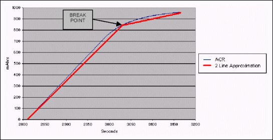 估算剩余充電時間時需要關注的一個數據點是斷點。斷點用于用兩條線近似充電期間的 ACR 曲線,如圖2所示。斷點由用戶選擇為 ACR 曲線“斷裂”的點,以便兩條線近似的誤差最小。