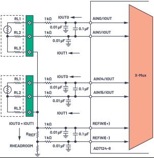 許多 RTD 系統(tǒng)設(shè)計人員使用集成多路復(fù)用器和激勵電流的 sigma-delta ADC,以實現(xiàn)多通道測量,并靈活地將激勵電流路由到每個傳感器。諸如 AD7124 之類的 ADC 允許單個引腳同時用作激勵電流和模擬輸入引腳(見圖 4)。IOUT 和 AIN 之間的共享引腳只需要每個 3 線 RTD 傳感器兩個引腳,從而增加了通道數(shù)。然而,在這種配置中,抗混疊或電磁干擾 (EMI) 濾波中的電阻 R 值較大,可能會給 RTD 電阻值增加誤差,因為 R 與 RTD 串聯(lián)——因此,可以使用有限的 R 值。這就是為什么通常建議為每個激勵電流源配備一個專用引腳,以避免 RTD 測量中可能出現(xiàn)的誤差。