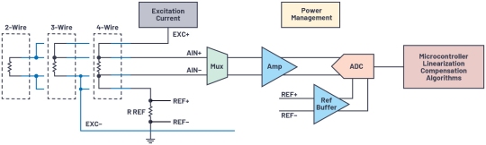 三種 RTD 接線配置具有不同的接線技術(shù),需要將 RTD 與其他外部組件以及 ADC 的要求(例如激勵電流和靈活的多路復(fù)用器)連接或連接。本節(jié)將更深入地了解并重點介紹每種 RTD 配置的電路設(shè)計和注意事項。