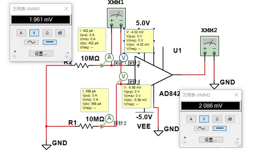 比如這個(gè)仿真圖中,輸入失調(diào)電流是0.4nA和0.6nA,那么當(dāng)輸入源阻抗是10MΩ時(shí),得到的輸入偏置電壓是-4.20mV和-5.96mV,然后同相輸入端和反相輸入端的凈輸入電壓差值就是1.96mV,因?yàn)闆](méi)有加增益電阻,所以這個(gè)儀表放大器是一倍放大,但是輸出是2.086mV是因?yàn)檩敵鲇袀€(gè)最小電壓疊加了,2.086-1.961=0.125mV。