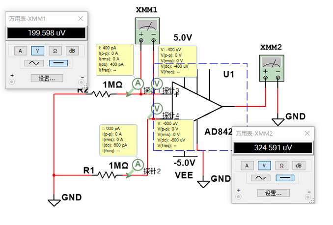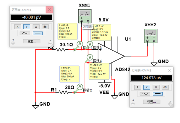 以上的仿真圖都是源阻抗相匹配的情況下,通過(guò)更改輸入源阻抗之后發(fā)現(xiàn),輸入電壓降低到了uV級(jí)別,輸出依然會(huì)多一個(gè)125uV的電壓。那么有沒(méi)有可能讓輸入的電壓無(wú)限接近于0呢?已知輸入偏置電流為0.4nA和0.6nA,那么仿真一下試試。