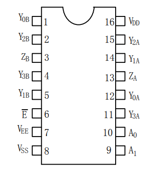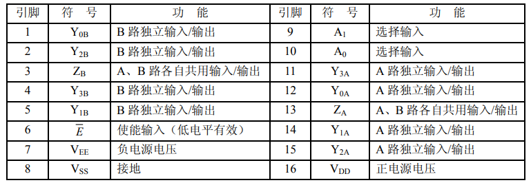 以CD4052為例介紹一下模擬開關的管腳,以及真值表(大多數(shù)模擬開關定義都差不多)。CD4052是一款帶有公共使能輸入控制位的2路四選一模擬開關電路。每一個多路選擇開關都有四個獨立的輸入/輸出(Y0到Y(jié)3)、一個公共的輸入/輸出端(Z)和選擇輸入端(A),那么接下來介紹一下大致的管腳定義: