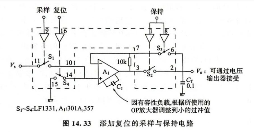 下圖是把采樣與保持以及復位電路通過OP放大器與IC模擬開關進行總結(jié)的一個示例。預先將S2與S3設為導通,如果S4斷開,S1為導通,就取樣。若將S2和S3設為斷開,CT就保持之前采樣的電壓(此時要考慮模擬開關的漏電流)。將S2與S3設為導通,如果S4導通,就復位(運放輸出跟隨同相輸入端輸出0,給電容保持放電,復位電容)。