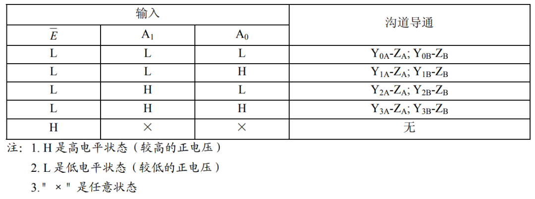 那么介紹完引腳說明,在看真值表就一目了然了,例如當使能端接到低電平時,如果A0和A1都是低電平,那么Y0A和ZA導通且Y0B和ZB導通: