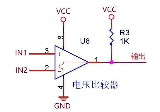 下面結(jié)合原理圖進(jìn)行說(shuō)明,如下圖原理圖,比較器輸入端的電壓為IN1、IN2,供電為VCC/GND,上拉電阻1K,上拉電壓為VCC。