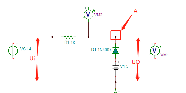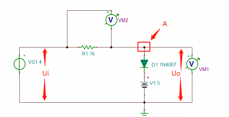 由于A點(diǎn)電壓小于4.3V,二極管導(dǎo)通,此時(shí)二極管等效為一個(gè)上負(fù)下正的電池,所以UO = 5-0.56= 4.44V(實(shí)際仿真二極管的壓降為0.56V)