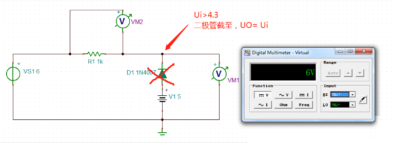 當(dāng)輸入信號(hào)大于4.44V時(shí),二極管截止,UO = Ui (符合理論)
