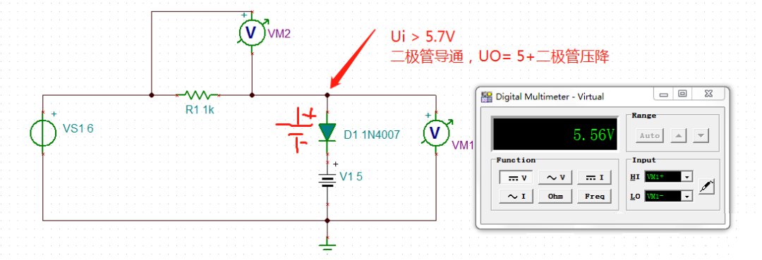 由于A點(diǎn)電壓大于5.7V,二極管導(dǎo)通,此時(shí)二極管等效為一個(gè)上正下負(fù)的電池,所以UO = 5+0.56= 5.56V(實(shí)際仿真二極管的壓降為0.56V)