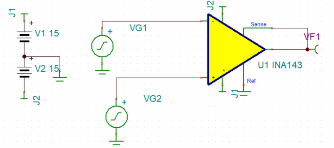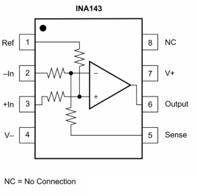 如上圖可以看出,在INA143內(nèi)部已經(jīng)集成了電阻直接構(gòu)成了差分放大。下面來(lái)看一下此差放的幾種接法: