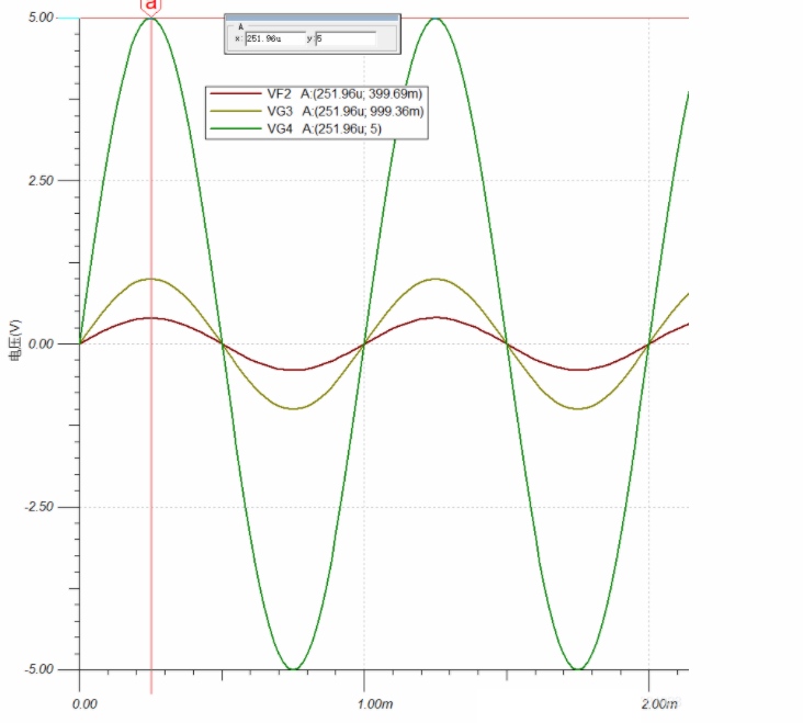 如下圖為10倍差分放大的仿真結(jié)果: