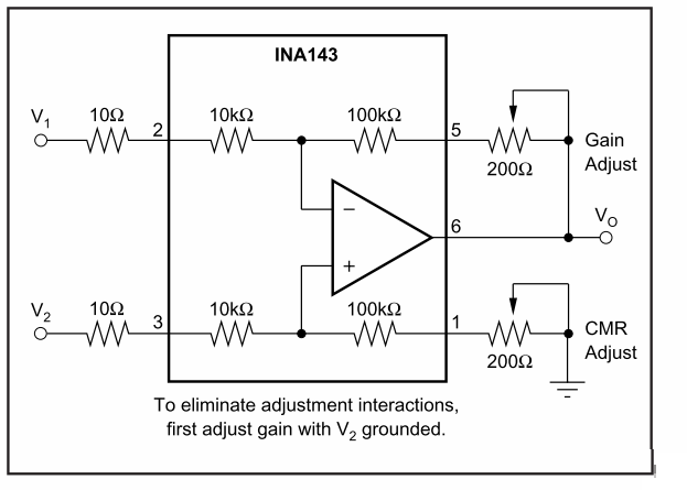差分放大器是將由運(yùn)放構(gòu)成減法電路外部的電阻集成到運(yùn)放內(nèi)部,利用激光微調(diào)技術(shù)將電阻的阻值調(diào)整到極高的精度,以此來(lái)減小誤差。