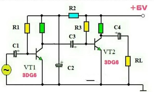電容C1的作用是將需要放大的電壓信號耦合到放大器的輸入端。好吧,“耦合”這個詞有點難理解,其實就是傳遞的意思。因為信號源直接輸入,會破壞放大器的工作狀態(tài),從而使放大器的性能變差,甚至不能工作。電容的通交流,阻直流的特點,可以將放大器和信號源之間的直流工作狀態(tài)相互隔離,同時能夠?qū)⒆兓男盘杺鬟f到VT1。