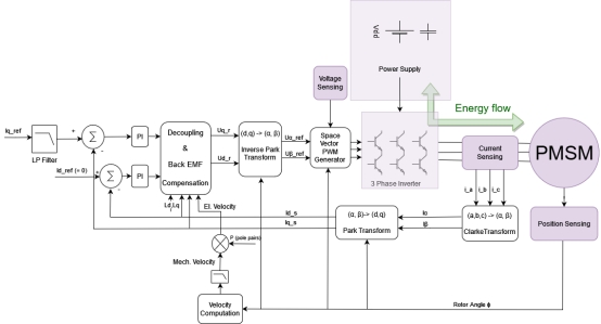 上圖突出顯示了FOC轉(zhuǎn)矩控制器的基本部件。它的主要輸入來自于q-電流,它直接對應(yīng)于電機(jī)產(chǎn)生的轉(zhuǎn)矩。與q電流外,與q電流正交的d電流在PMS電機(jī)的FOC中起著至關(guān)重要的作用。q電流與轉(zhuǎn)矩直接相關(guān),而d電流負(fù)責(zé)控制電機(jī)中的磁通量。在正常工作條件下,PMSM的d電流被理想地設(shè)置為零。這是因?yàn)殡姍C(jī)固有的磁場是從永磁體中獲得的,而任何由非零d電流引起的額外通量都會降低效率,而且通常是不必要的。保持d電流在零可以優(yōu)化每安培的扭矩,確保電機(jī)有效運(yùn)行,不會產(chǎn)生過多的熱量。然而,在像磁場減弱這樣的情況下,d電流從這個零值調(diào)整,以允許操作超過電機(jī)的基本速度。正確管理d流,保持在零,必要時調(diào)整,確保最佳電機(jī)效率,防止退磁雖然某些功能塊需要硬件實(shí)現(xiàn),但控制器的核心邏輯主要是在單片機(jī)、DSP或FPGA中作為軟件執(zhí)行的。該位置傳感器便于在全速度下,特別是在較低速度下,電動機(jī)的FOC操作。