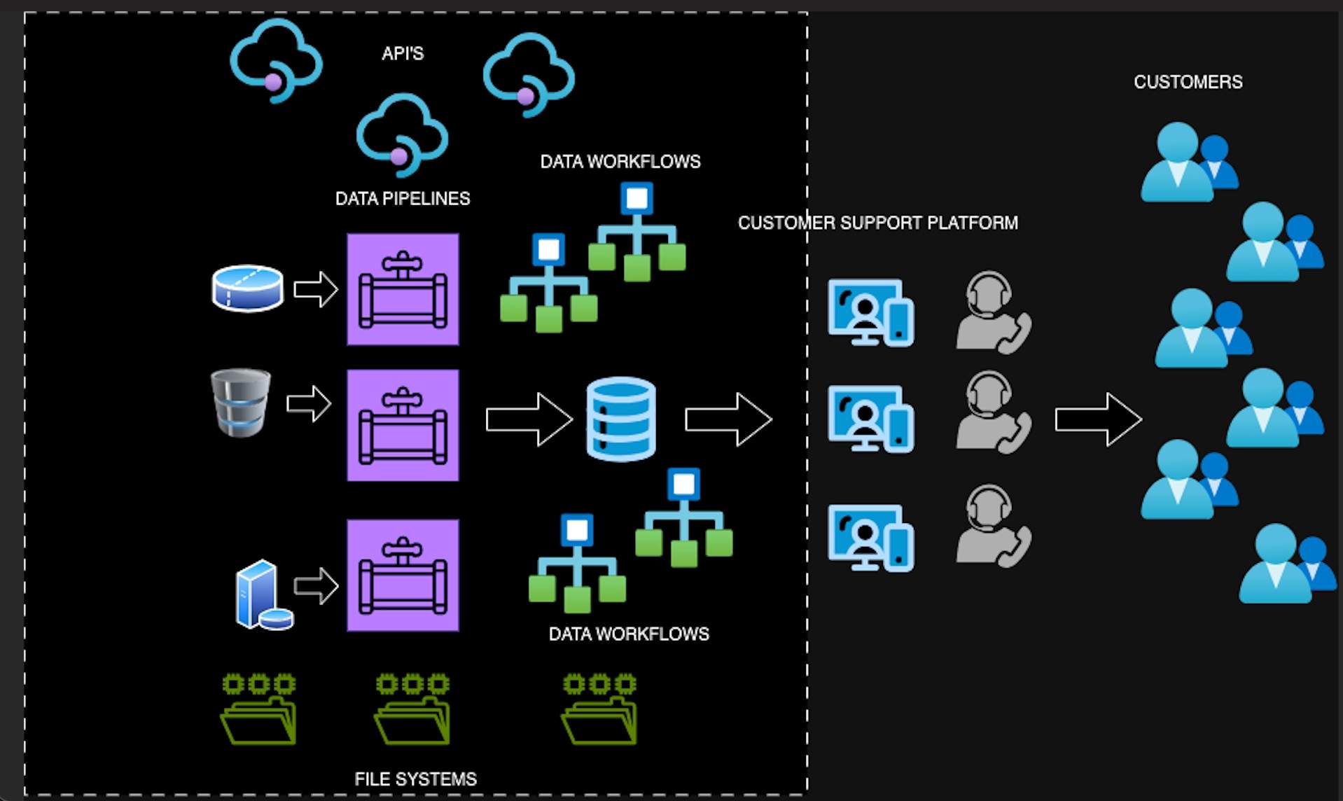 請(qǐng)參閱下圖,其中銷(xiāo)售團(tuán)隊(duì)與客戶(hù)合作以確保準(zhǔn)確的數(shù)據(jù),左側(cè)表示數(shù)據(jù)工程流程,其中數(shù)據(jù)來(lái)自各種系統(tǒng),包括文件系統(tǒng)、API和數(shù)據(jù)庫(kù)。數(shù)據(jù)工程師建立和管理復(fù)雜的管道和工作流程,將這些數(shù)據(jù)合并為客戶(hù)支持團(tuán)隊(duì)使用的最后數(shù)據(jù)集。由于企業(yè)組織中管道的復(fù)雜性和數(shù)量,確定數(shù)據(jù)來(lái)源問(wèn)題變得具有挑戰(zhàn)性。因此,簡(jiǎn)單的問(wèn)題比如,"我們從哪里獲取這些數(shù)據(jù)?"和"數(shù)據(jù)流中有什么中斷?"鑒于企業(yè)組織可以維護(hù)數(shù)百條管道,這將成為數(shù)據(jù)工程師面臨的嚴(yán)峻挑戰(zhàn)。