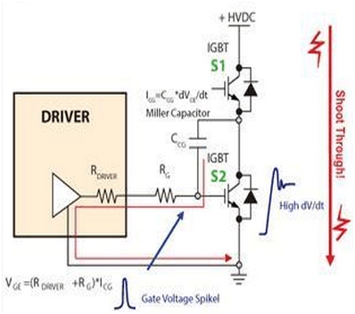 IGBT半橋電路運(yùn)作時(shí)的一個(gè)常見問題是因米勒電容引起的寄生導(dǎo)通問題,如下圖所示。S2處于關(guān)斷狀態(tài),S1開通時(shí),S2兩端會(huì)產(chǎn)生電壓變化(dv/dt),將會(huì)形成因自身寄生米勒電容CCG所引發(fā)的電流,這個(gè)電流流過柵極電阻RG與驅(qū)動(dòng)內(nèi)部電阻,造成IGBT柵極到射極上的壓降,如果這個(gè)電壓超過IGBT的柵極臨界電壓,那么就可能造成S2的寄生導(dǎo)通,形成短路,引起電流擊穿問題,進(jìn)而可能導(dǎo)致IGBT損壞。
