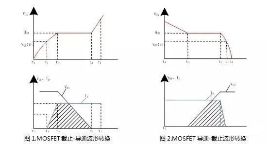 MOSFET導(dǎo)通與關(guān)斷過程中都會(huì)產(chǎn)生損耗,在這兩個(gè)轉(zhuǎn)換過程中,漏極電壓與漏極電流、柵源電壓與電荷之間的關(guān)系如圖1和圖2所示,現(xiàn)以導(dǎo)通轉(zhuǎn)換過程為例進(jìn)行分析: