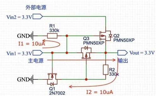 1、如果Vin1 = 3.3V,NMOS Q1導通,之后拉低了PMOS Q3的柵極,然后Q1也開始導通,此時,Q2的柵極跟源極之間的電壓為Q3的導通壓降,該電壓差不多為幾十mV,因此Q2關(guān)閉,外部電源Vin2斷開,Vout由Vin1供電,Vout = 3.3V。此時整個電路的靜態(tài)功耗I1+I2 = 20uA。