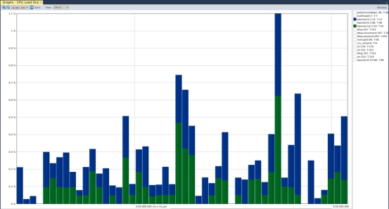 從跟蹤中選擇另一個(gè)內(nèi)核線程會(huì)顯示其中一個(gè)內(nèi)核線程的執(zhí)行時(shí)間出現(xiàn)相對(duì)較大的峰值?!癈PU 負(fù)載”視圖描述了不同參與者的 CPU 利用率。我們可以看到,突出顯示的內(nèi)核線程的執(zhí)行時(shí)間峰值不會(huì)導(dǎo)致 CPU 利用率異常高(最大 CPU 利用率略高于 1%)。因此,該峰值無(wú)需擔(dān)心。