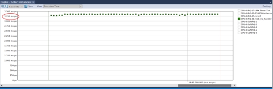 下一個(gè)重要視圖是參與者實(shí)例。選擇下拉菜單中的“執(zhí)行時(shí)間”將生成一個(gè)圖表,該圖表指示任何特定“參與者”(定義為任何執(zhí)行元素,例如線程或進(jìn)程)所占用的時(shí)間量。選擇一個(gè)內(nèi)核線程會(huì)顯示其執(zhí)行時(shí)間在 350、450 和 550 微秒處出現(xiàn)幾個(gè)峰值。要了解這些峰值是否真的值得關(guān)注,我們需要了解系統(tǒng)的時(shí)序要求或?qū)⑵渑c系統(tǒng)在“正?!睏l件下的運(yùn)行情況評(píng)估進(jìn)行比較。
