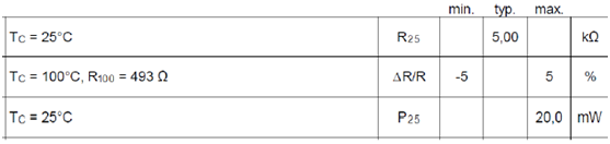 電阻的最大相對偏差由定義在100度下的ΔR/R值來表示。為了避免NTC的自加熱,NTC自身的功耗需要被限定。為了限定NTC的自身溫升不超過最大允許值1K,通過NTC的電流可以由下式計算。