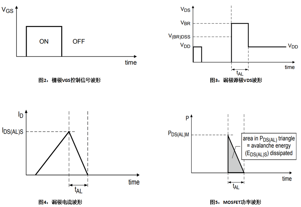 在圖4中,雪崩電流最大值IDS(AL)S和電流衰減時間tAL,及圖5中的雪崩功率PDS(AL)M都和感性負載的感值,MOSFET關閉前電流的最大值有關。