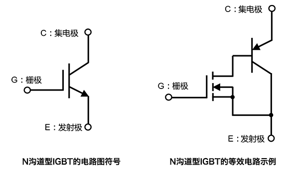 N溝道IGBT的電路圖符號及其等效電路如下。有些等效電路圖會更詳細一些,但這里為了便于理解,給出的是相對簡單的示意圖。包括結(jié)構(gòu)在內(nèi),實際的產(chǎn)品會更復(fù)雜一些。