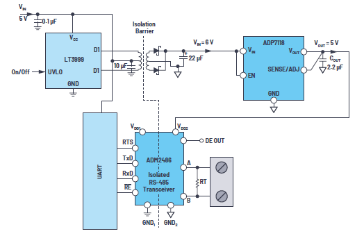 針對隔離RS-485節(jié)點的電源鏈分割,ADI公司大致提供三類解決方案: