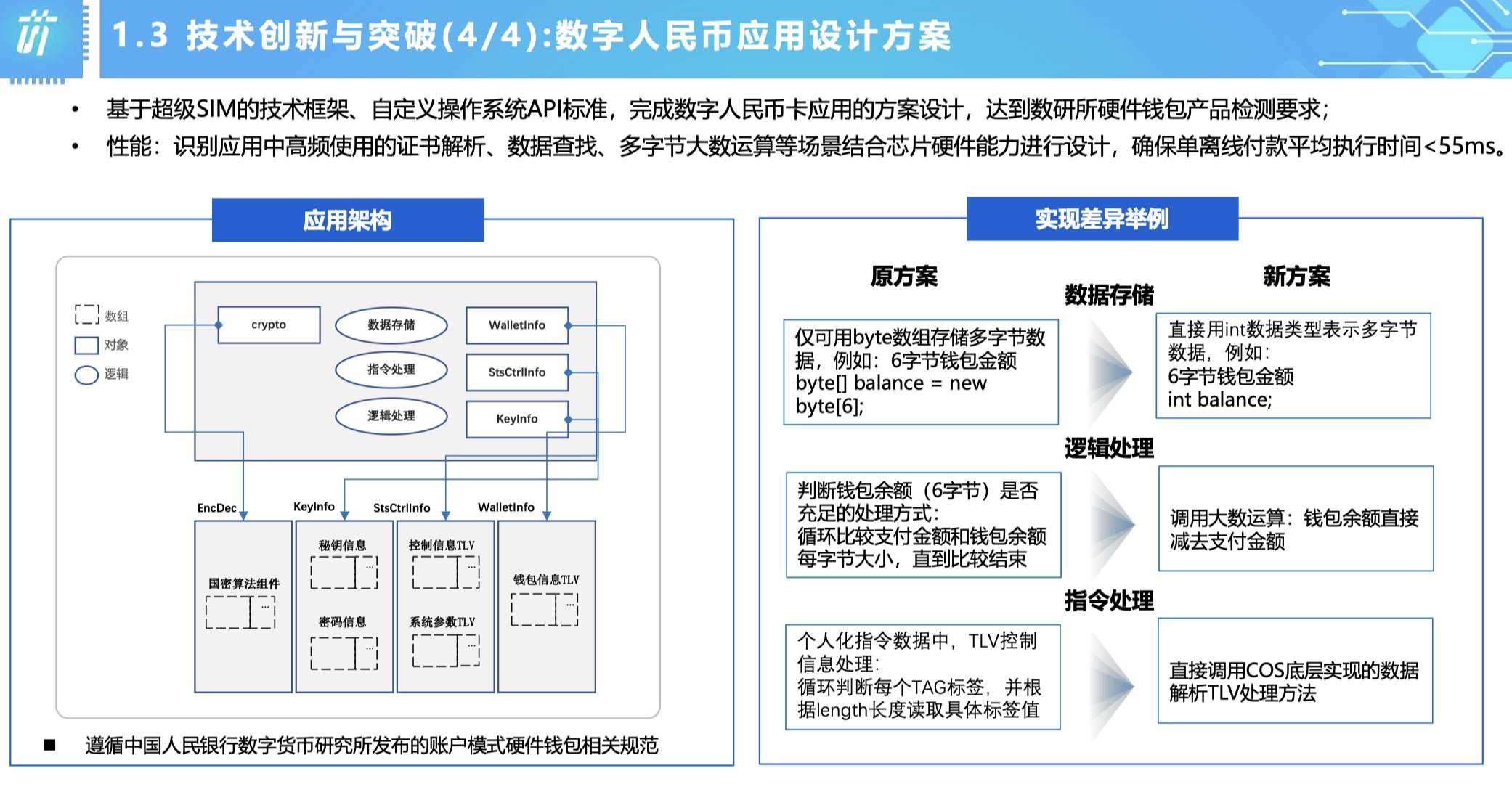 “基于數(shù)字人民幣去應(yīng)用我們擴(kuò)展的一些指令,能夠真正的幫助到應(yīng)用實(shí)現(xiàn)。不管在數(shù)據(jù)存儲(chǔ)、邏輯處理、指令處理,采用我們指令定義的新方案都比原方案在功能和性能上有了明顯的提升?!眲⒚肪攴窒淼?。