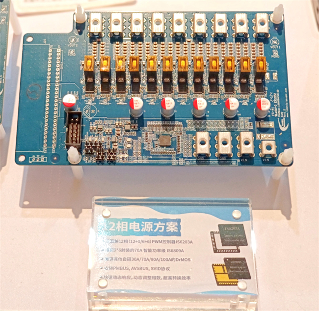 現(xiàn)場(chǎng)分享的IS6203A是一款多數(shù)字接口協(xié)議的雙路12相PWM控制器,支持PMBus、AVSBus、SVID協(xié)議,每相開關(guān)頻率可達(dá)200kHz-3MHz,采用長(zhǎng)工微專利TCOT?控制算法能夠?qū)崿F(xiàn)xPU所需的快速瞬態(tài)動(dòng)態(tài)響應(yīng)及精細(xì)化的電源分配和控制策略??纱钆渥匝械?0A/70A/90A/100A DrMOS,通過(guò)工藝優(yōu)化具備更優(yōu)秀的轉(zhuǎn)換效率和動(dòng)態(tài)負(fù)載適應(yīng)能力,達(dá)到功率密度與體積的平衡。