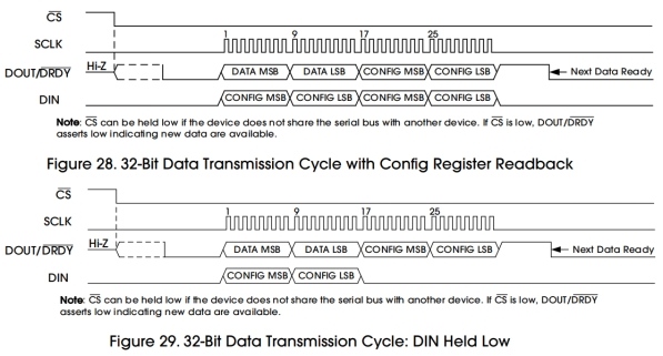 在32位的數(shù)據(jù)傳輸周期中,數(shù)據(jù)由四字節(jié)組成:前兩個(gè)字節(jié)包含轉(zhuǎn)換結(jié)果,后兩個(gè)字節(jié)為配置寄存器的回讀數(shù)據(jù)。系統(tǒng)始終優(yōu)先讀取最高有效字節(jié)(MSB)。