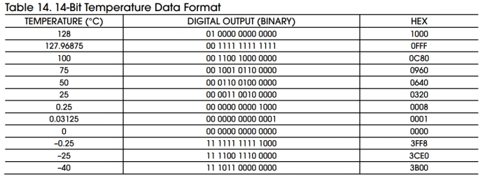 啟用內(nèi)置溫度傳感器模式,需將配置寄存器CONFIG REGISTER中的TS_MODE位設(shè)置為1。此時(shí),溫度數(shù)據(jù)將以16位轉(zhuǎn)換結(jié)果中的14位左對(duì)齊格式表示,且從最高有效字節(jié)(MSB)開始輸出。讀取這兩個(gè)數(shù)據(jù)字節(jié)時(shí), 前14位用于表示溫度測(cè)量結(jié)果。一個(gè)LSB 等于 0.03125°C。負(fù)數(shù)以二進(jìn)制補(bǔ)碼格式表示,如下表所示。
