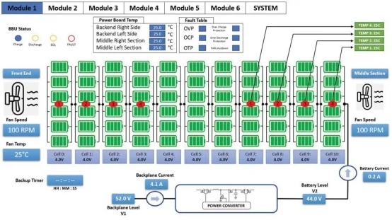 當(dāng)模塊運(yùn)行時(shí),圖形界面是一個(gè)重要的資源,為電池堆棧和背板提供了重要的指標(biāo)。這些度量具有廣泛的范圍,包括輸入和輸出電壓以及電流等關(guān)鍵數(shù)據(jù)。模塊操作和圖形界面之間的動(dòng)態(tài)交互為用戶提供了對(duì)系統(tǒng)性能和能量動(dòng)態(tài)的完整和實(shí)時(shí)的感知。