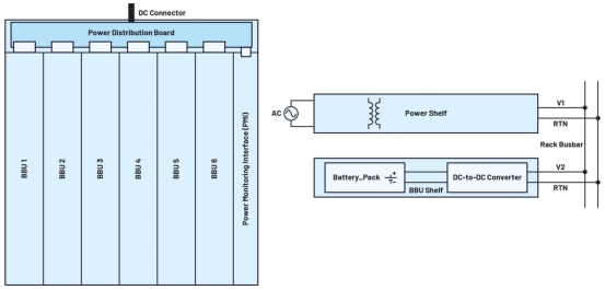 根據(jù)OCP對(duì)其新的Orv3架構(gòu)的定義,開(kāi)放式機(jī)架電源架構(gòu)由一個(gè)集中的可伸縮電源架和一個(gè)BBBU機(jī)架組成,它們通過(guò)一個(gè)公共總線條向有效載荷設(shè)備(IT齒輪)分配電源。此規(guī)范將定義適合于開(kāi)放架的BBU架子。該BBU架將包含6個(gè)具有5+1冗余的BBU模塊,為機(jī)架內(nèi)的所有有效載荷提供直流電源。當(dāng)發(fā)生交流斷電時(shí),BBU架可以提供最高功率等級(jí)的電源架在指定的備份時(shí)間段。BBU架備份時(shí)間允許機(jī)架在不中斷齒輪的情況下在電源之間移動(dòng),并允許在電源丟失之前排水或移動(dòng)應(yīng)用程序。
