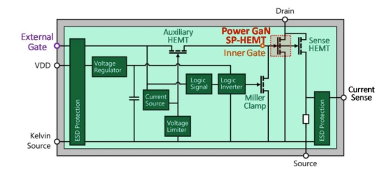 Cambridge GaN Devices 是一家無晶圓廠半導(dǎo)體公司,開發(fā)了一系列額定電壓為 650 V 的硅基 GaN 功率器件。一種稱為 ICeGaN? 的新型柵極接口以及感測和保護電路被單片集成到單個芯片解決方案中。圖 1 顯示了 ICeGaN? 電路的原理框圖。主功率 HEMT 是肖特基 p 柵極 GaN HEMT,額定電壓為 650V,V th約為 1.6V。
