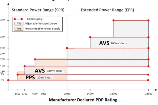 在 USB-PD 3.2 中,AVS 對于某些功率輸出范圍(27-100 W)是必需的。此功能允許充電器調(diào)整電壓輸出以更好地滿足設(shè)備需求,從而大大提高充電效率。