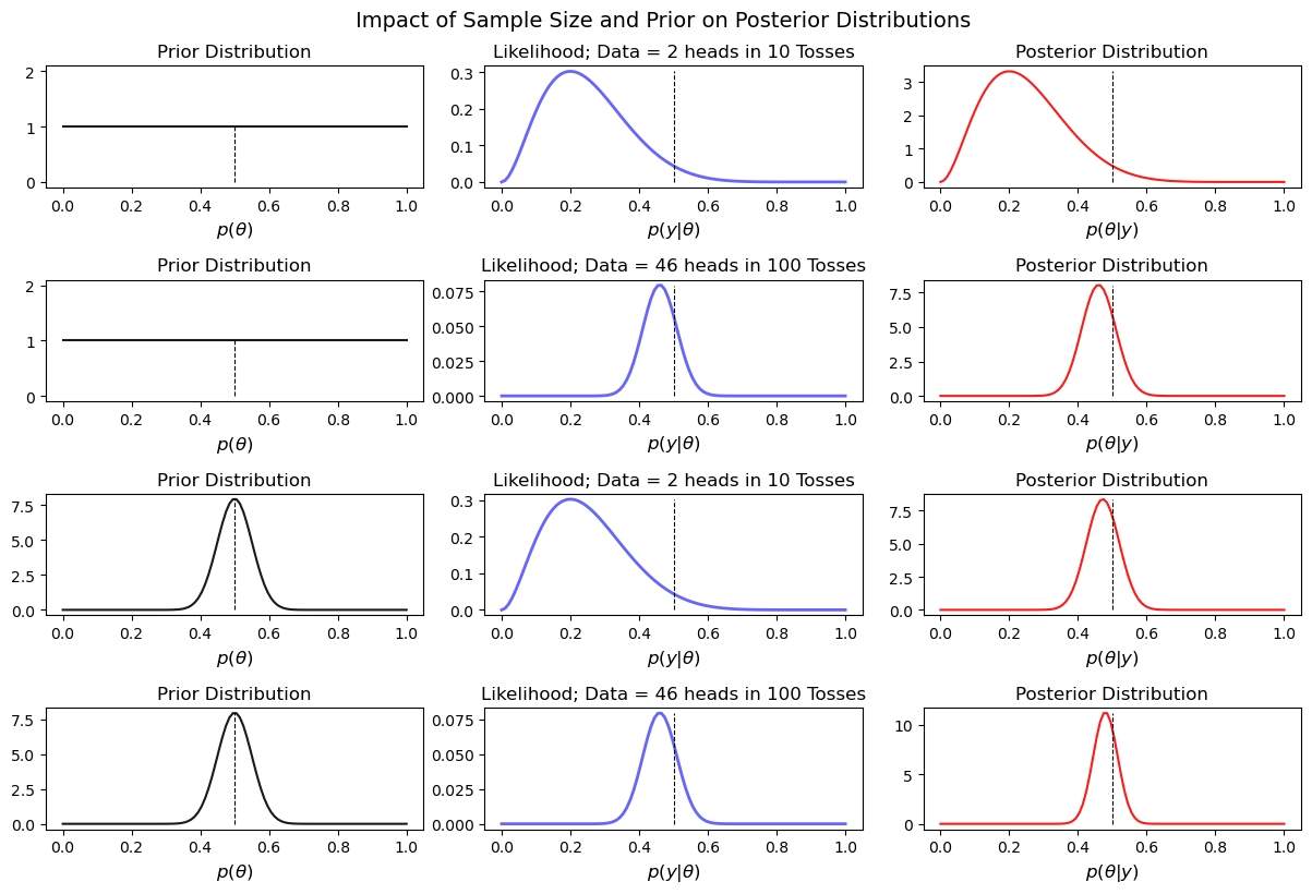 運(yùn)行中的貝葉斯更新: 下面的圖展示了一個(gè)簡(jiǎn)單的拋硬幣實(shí)驗(yàn)的后向分布,它跨越不同的樣本尺寸和兩個(gè)不同的前向分布。這個(gè)可視化提供了對(duì)不同樣本尺寸和先前信念的組合如何影響結(jié)果的后向分布的洞察力。