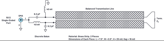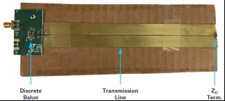 · 用Z設(shè)計(jì)并制作了一條平行輸電線路。 O 等于先前使用的電阻值。傳輸線路連接在電路中,電阻端移動(dòng)到線路的末端。見(jiàn)圖4和圖5。網(wǎng)絡(luò)分析儀或反射計(jì)再次用于驗(yàn)證返回?fù)p失保持良好--大約25分貝或更好。