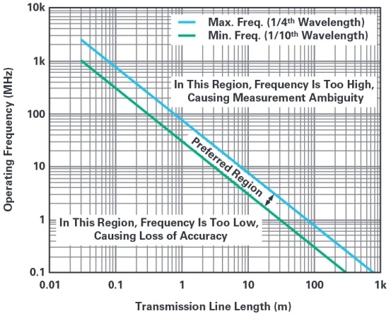 · 根據(jù)正常傳輸?shù)拈L(zhǎng)度選擇一個(gè)工作頻率,傳輸線路長(zhǎng)度將與水箱高度相同或稍長(zhǎng)。應(yīng)選擇傳輸線路長(zhǎng)度一般為空氣中射頻波長(zhǎng)的十分之一至四分之一的工作頻率。圖3說(shuō)明了這個(gè)近似頻率范圍。一個(gè)較低的頻率將提供最好的線性回報(bào)損失。流體水平,雖然較高的頻率會(huì)提供更大范圍的返回?fù)p失信號(hào),但線性度可能沒(méi)有那么好,并且測(cè)量可能出現(xiàn)折回(圖2)。如果要求遵守輻射排放,可從適用的ISM頻率清單中選擇頻率。