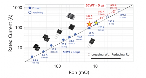 圖 2:使用 SCCL 將 GaN HEMT SCWT 提高至 5 μs,且額定值較低