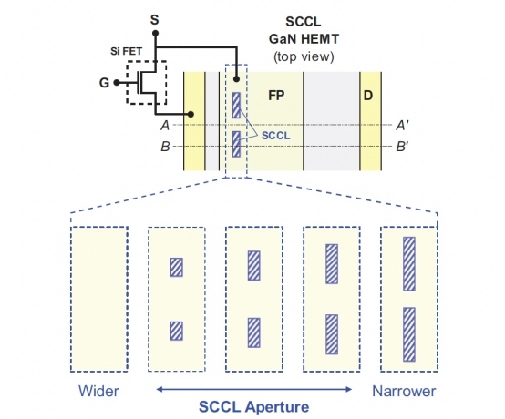 Transphorm 擁有一項(xiàng)專(zhuān)利技術(shù),稱(chēng)為短路電流限制器 (SCCL)。該技術(shù)的目標(biāo)是降低器件 I DSAT,這是通過(guò)使用專(zhuān)有工藝去除 2DEG 通道中的區(qū)域來(lái)實(shí)現(xiàn)的。因此,可以創(chuàng)建一個(gè)掩蔽的 SCCL 孔徑,指示有源 2DEG 區(qū)域,從而根據(jù)客戶需求使用標(biāo)準(zhǔn)晶圓廠工藝減少器件的有源區(qū)域。如圖 1 所示。