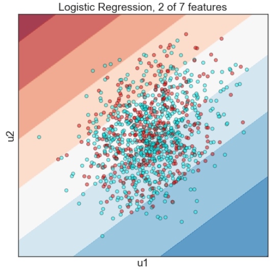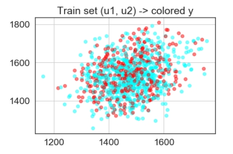 無(wú)花果。1顯示訓(xùn)練樣本中兩個(gè)主要特征----U1和U2----坐標(biāo)中各點(diǎn)的映射。點(diǎn)的顏色對(duì)應(yīng)于類(lèi)(紅色-0,水-1)。