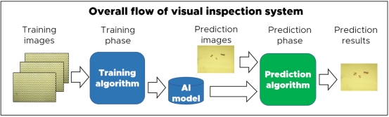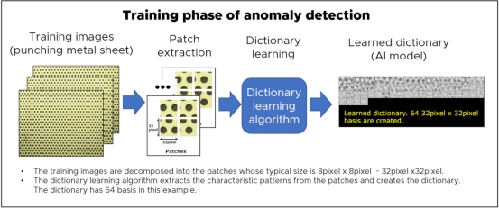 在這個例子中,目標(biāo)是檢測作為異物的穿孔金屬上的螺絲。首先,制備無異常穿孔金屬的圖像。為了避免由于相機角度和目標(biāo)位置的不同而產(chǎn)生錯誤,建議從略有不同的角度準備幾十個訓(xùn)練圖像。在訓(xùn)練階段,這些訓(xùn)練圖像被輸入到訓(xùn)練算法中,以創(chuàng)建一個AI模型。如果檢查目標(biāo)沒有改變,只需要創(chuàng)建一次AI模型。