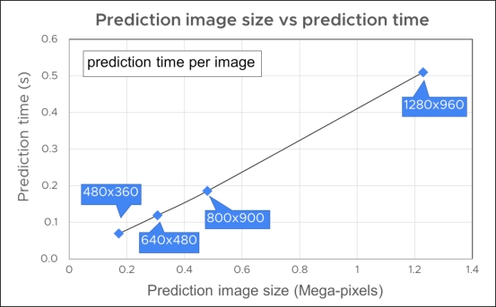 圖9顯示了飛行起重機模式的預(yù)測圖像大小和預(yù)測時間圖。每1280像素x960像素的預(yù)測圖像尺寸的訓(xùn)練時間大約只有0.6%秒.隨著圖像尺寸的減小,480像素x360像素的學(xué)習(xí)時間幾乎線性減少到不到0.1秒。